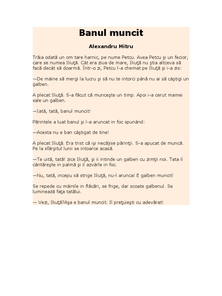 Banul muncit de alexandru mitru pdf. Actualizat de irina cristina pe 22 octombrie 2015. învăţământ primar limba şi literatura română lecţii clasa 1. Alexandru mitru banul muncit 1. De mâine să mergi la lucru și să nu te întorci.