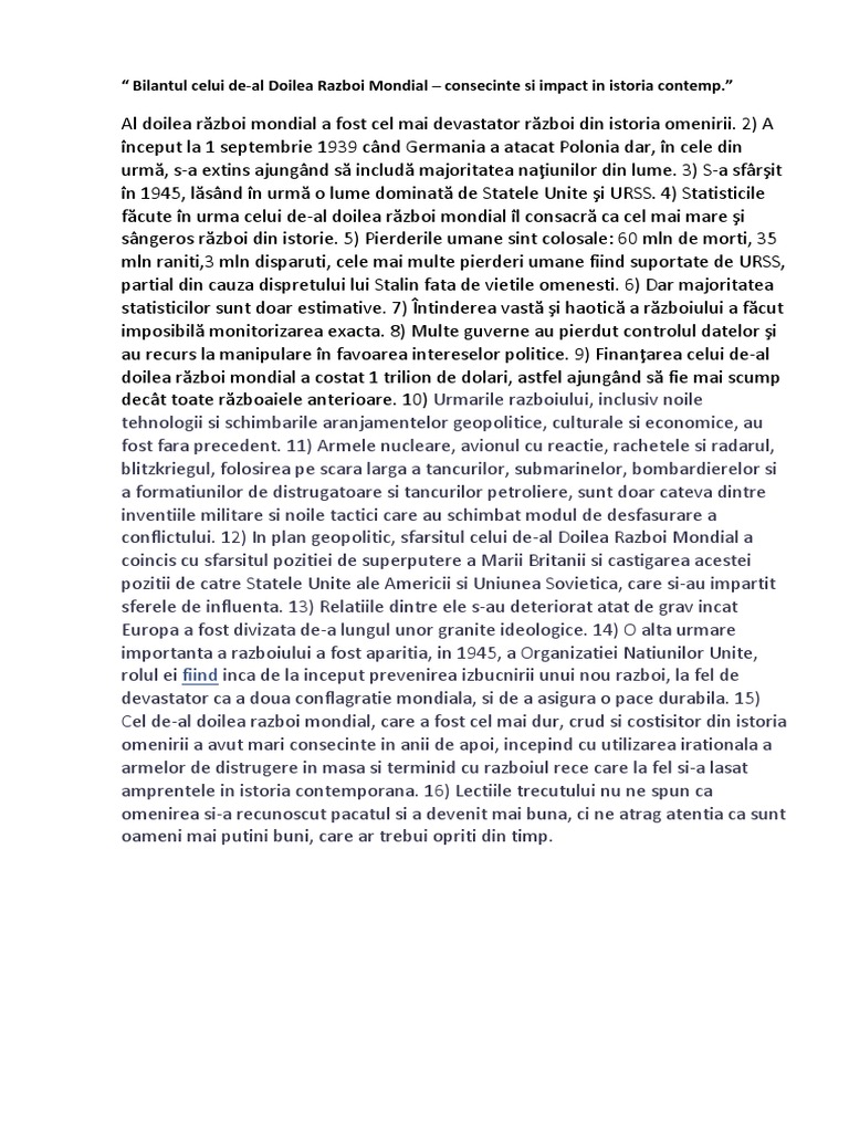 Cel de al doilea razboi mondial a provocat omenirii imense pierderi de vieti omenesti de bunuri pirituale si materiale. Numarul victimelor a fost urias peste 55 milioane de morti si disparuti dintre care 28 de milioane de persoane civile numarul acestora depasindu l pe cel al militarilor fapt caracteristic razboiului total. Consecintele umane ale celui de al doilea razboi mondial au fost si raman inimaginabile. Consecintele celui de al doilea razboi mondial dumitrascu andreea popa adrian barbulescu eduard filip alina schimbările de frontieră.