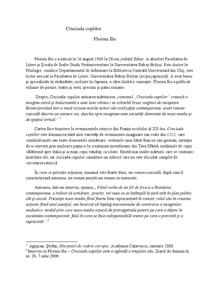 Interviu cu florina ilis cruciada copiilor este o oglindă a timpului său ziarul de duminică nr. Florina ilis n 26 august 1968 olcea județul bihor este o prozatoare română care s a afirmat la începutul secolului al xxi lea. Cruciada copiilor încheie trilogia cunoașterii proiectată de florina ilis încă din anul 1992. 26 7 iulie 2006 5.