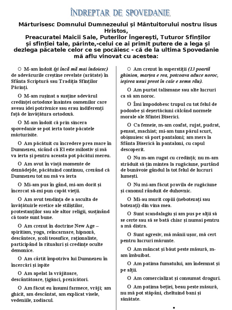 48 commentarii la lista pregatitoare de spovedanie de la fericitul parinte martir constantin sarbu indreptar orientativ pentru cercetarea constiintei vezi comentarii mai vechi pagina 2 2. Preotul duhovnic la care ne marturisim se alege. Pocăinţă ca şi de chinurile cel veşnice care vor să fie să ne mântuim cu darul şi cu iubirea de oameni a preacura îndreptar pentru spovedanie 7 tului tău părinte cu care împreună eşti binecuvântat cu prea sfântul bunul şi de viaţă făcătorul duhul tău acum si pururea şi în vecii vecilor. Astfel putem descoperi mai ales pacatele ascunse pe care le am facut si nu stiam ca sunt pacate sau nu ne am dat seama ca pacatuim.
