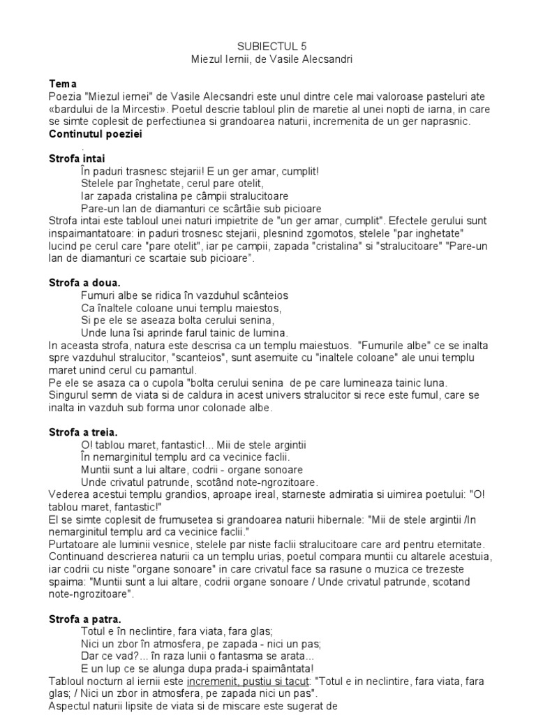 Miezul iernei de vasile alecsandri. Vasile alecsandri înfăţişează imaginea unei nopţi de iarnă cu un ger cumplit. E un ger amar cumplit. în păduri trăsnesc stejarii. Pastelul este o specie a genului liric în versuri în care se prezintă din perspectiva eului liric contemplator un anotimp un colt de natura un moment al zilei un aspect din viața micilor viețuitoare.