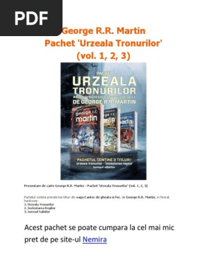 Urzeala tronurilor în limba română format pdf. Descopera faimoasa serie epica a lui george r r. Martin descarcă primul volum online gratis pdf în aceste două volume ale seriei urzeala tronurilor game of thrones scrisă de george r r. Primele 8 volume pentru voi linkul de descărcare.